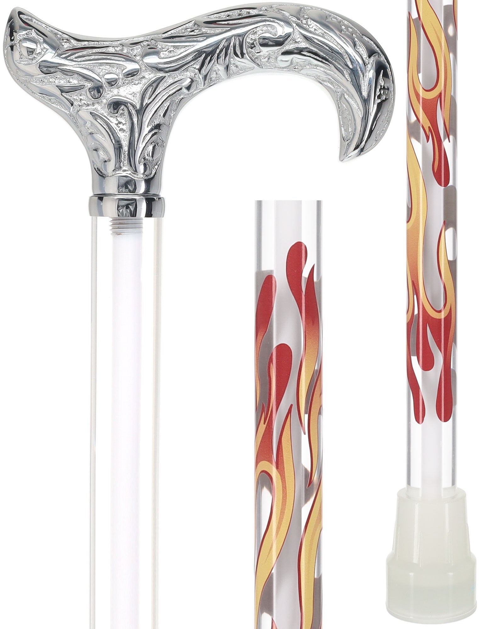Flame Crystal Elegance Chrome Derby Cane with Invisible Acrylic Shaft Options