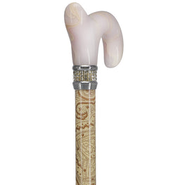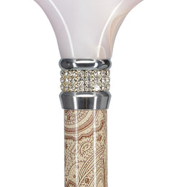 Elegant craftsmanship of a durable yet lightweight adjustable cane with a creamy white marbled derby-style handle uniquely designed to imitate real marble yet is very lightweight and not top heavy. The handle is joined to an artistic aluminum shaft with a painted classic paisley styled finish and is very sturdy with a wide durable tip.