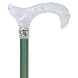Go Green! This walking cane is eco-friendly by producing zero toxins in the air. Ok, seriously, the Lucky Green designer cane is a superb choice to expand your collection of clothing accessories. The walking cane features a blend of whites to light grey in the pearlescent derby style handle. Just below the handle resides a placement of sparkling rhinestones to provide an extra spark of beauty. The adjustable green shaft of the cane is made from aluminum, making it very lightweight. Finally, the shaft is also adjustable which allows you to fit to your correct height level.