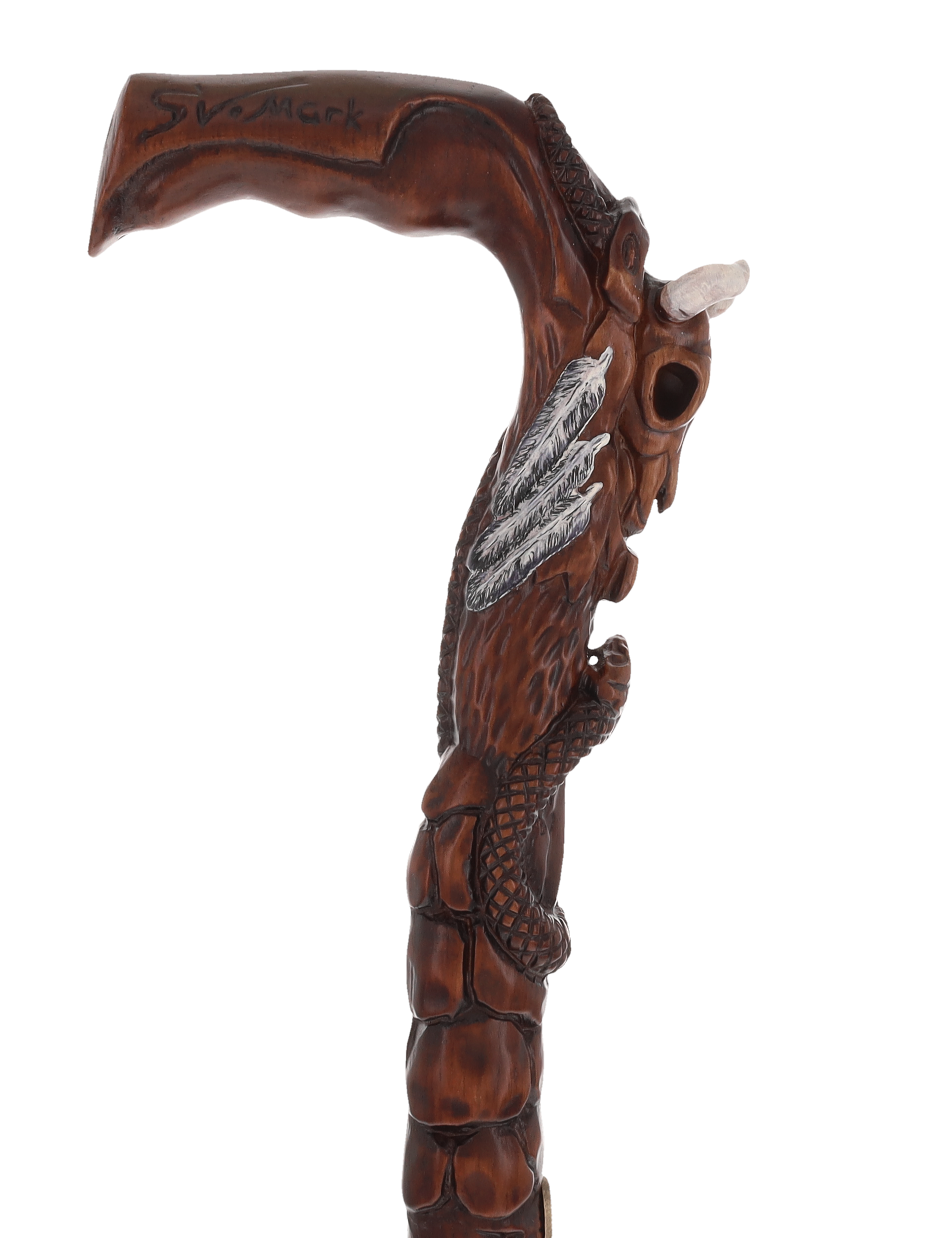 Indulge in luxury with our Buffalo Skull Snake artisan cane. Each piece is expertly handcarved from high-quality wood, featuring intricate details of a buffalo skull and snake. Elevate your style and mobility with this one-of-a-kind accessory. Own a piece of artistry and functionality with our artisan cane.
