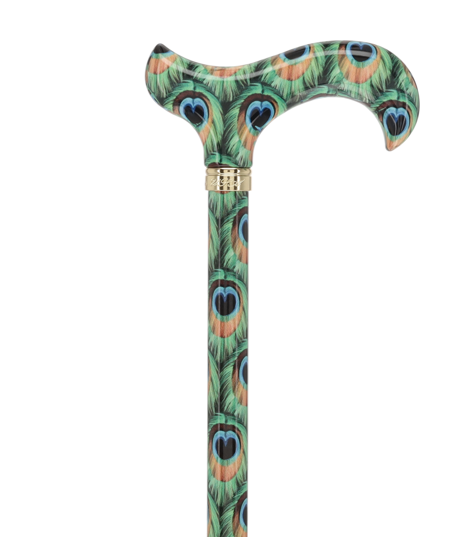 Get ready to strut your stuff and elevate your walking experience with the Pretty Peacock Designer Adjustable Cane! Adorned with a stunning peacock feather pattern in vibrant green, this cane will make a statement wherever you go. Its comfortable derby handle and gold engraved collar provide a secure grip for all your daily activities, from running errands to going on cultural outings. Make a unique and elegant statement by pairing it with your favorite green jacket.
