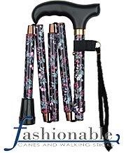 Our 'newest' collection of foldable walking canes are a must have! They are compact size and come is many beautiful floral prints. Each foldable cane has a shaft that is adjustable in length and that is made of Aluminum. This walking cane has a stylish classic black derby handle with a black backdrop. There is a peaceful array of pink and red berrys and delicate fowers with sparse greenery around the shaft. The walking cane also comes with a nylon strap and a beautiful 'tartan' pattern pouch bag. Having one of the smallest foldable walking canes on the market will make the next time you travel much easier. They can even fit in your handbag or they can make great gifts. Just click-on the tab below the picture for a closer look.