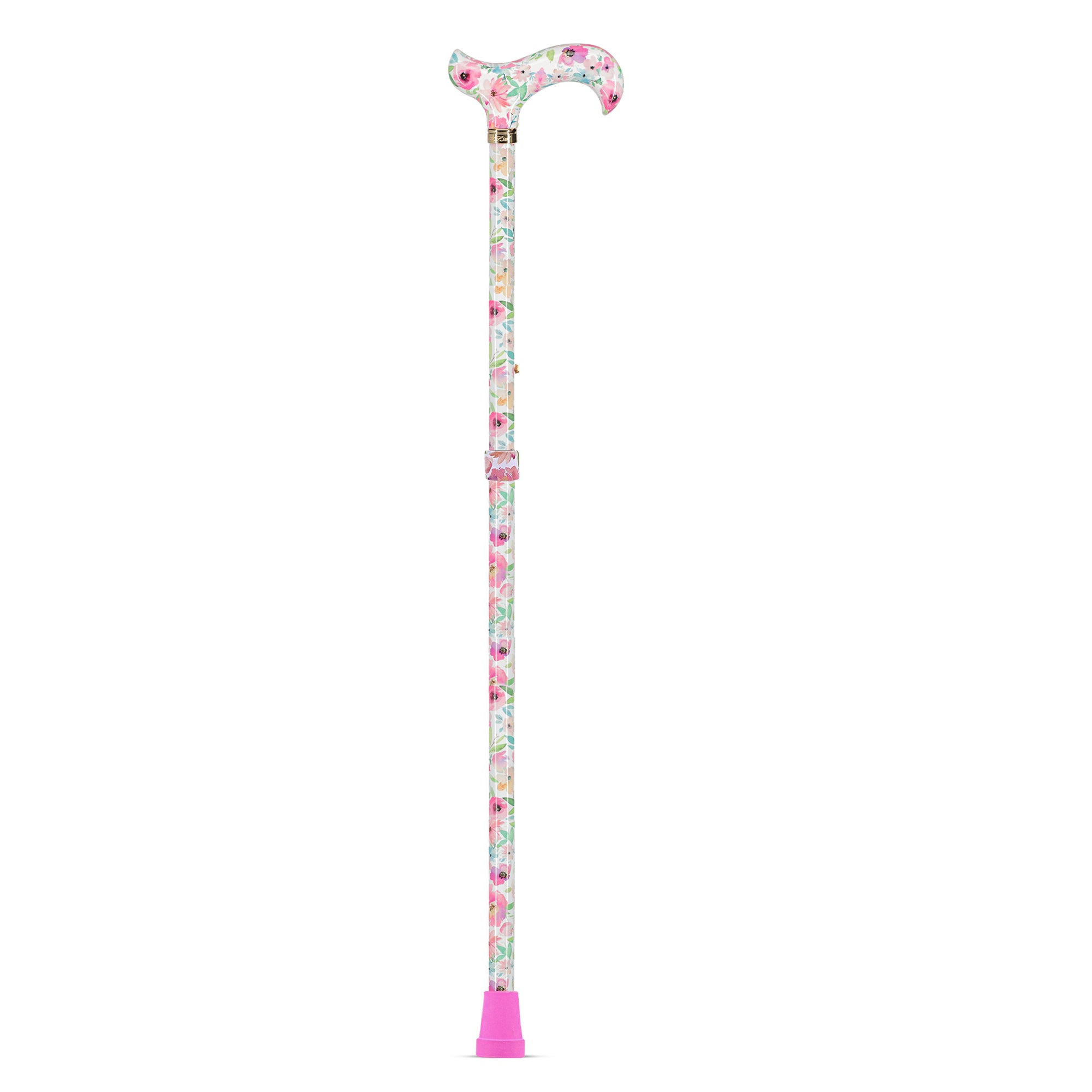 The vibrant colors of the Watercolor Flowers Vivienne May Designer Derby Adjustable Cane make this item a staple for cane aficionados and fashionistas. The intricate flower design sprawls along the shaft and derby handle to create an instantly classic design that will pair well with a variety of outfits.