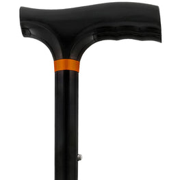 A classic black folding cane perfect for any occasion. The comfort Fritz handle is made of a solid wood with a deep brown stain that coordinates perfectly with the shiny black aluminum shaft. The aluminum shaft allows this cane to be lightweight, durable and adjustable. The Fritz handle's open design is perfect for users with large hands and/or arthritis. An embossed brass collar beneath the handle adds sophistication to this classic folding cane. Perfect for travel or everyday use.
