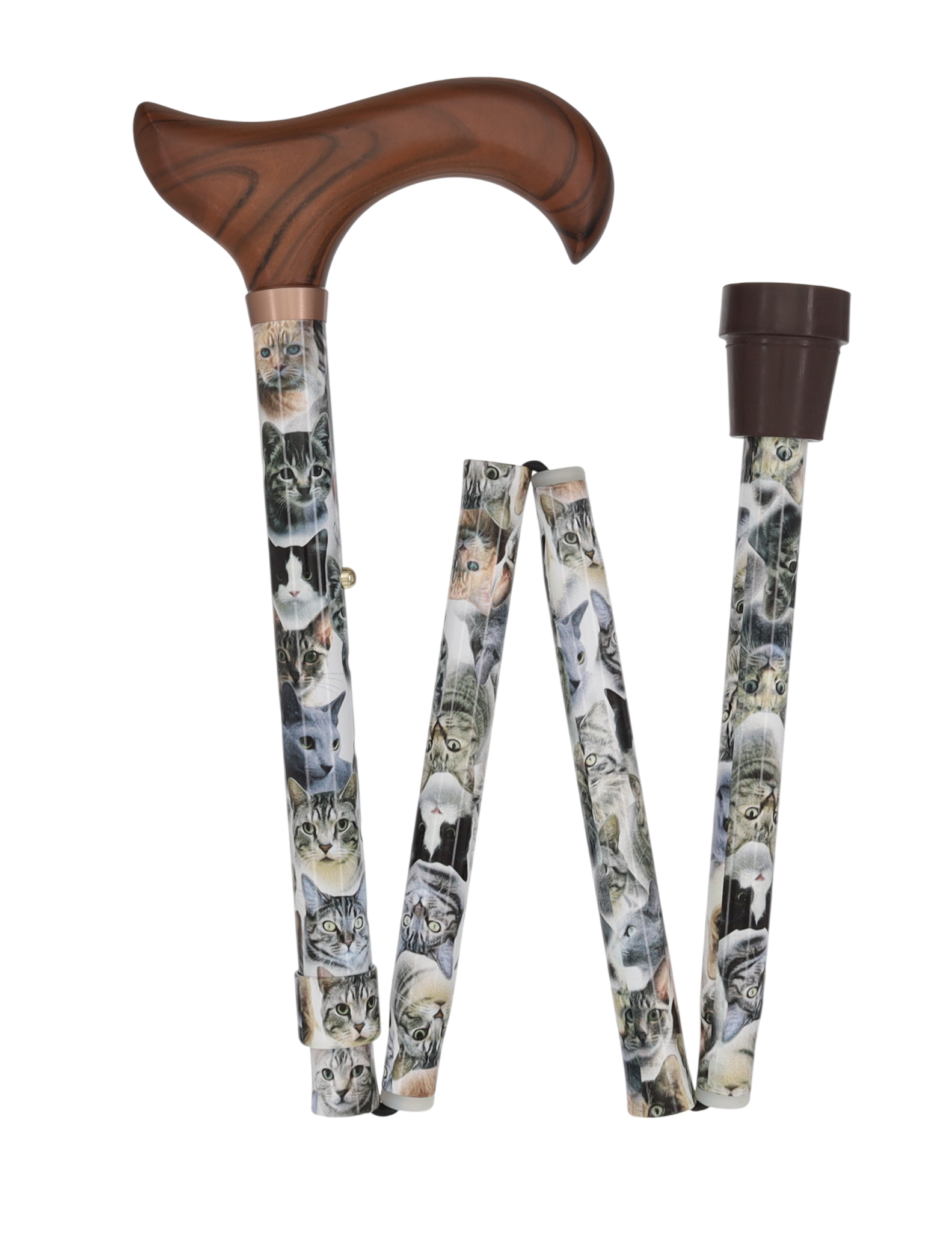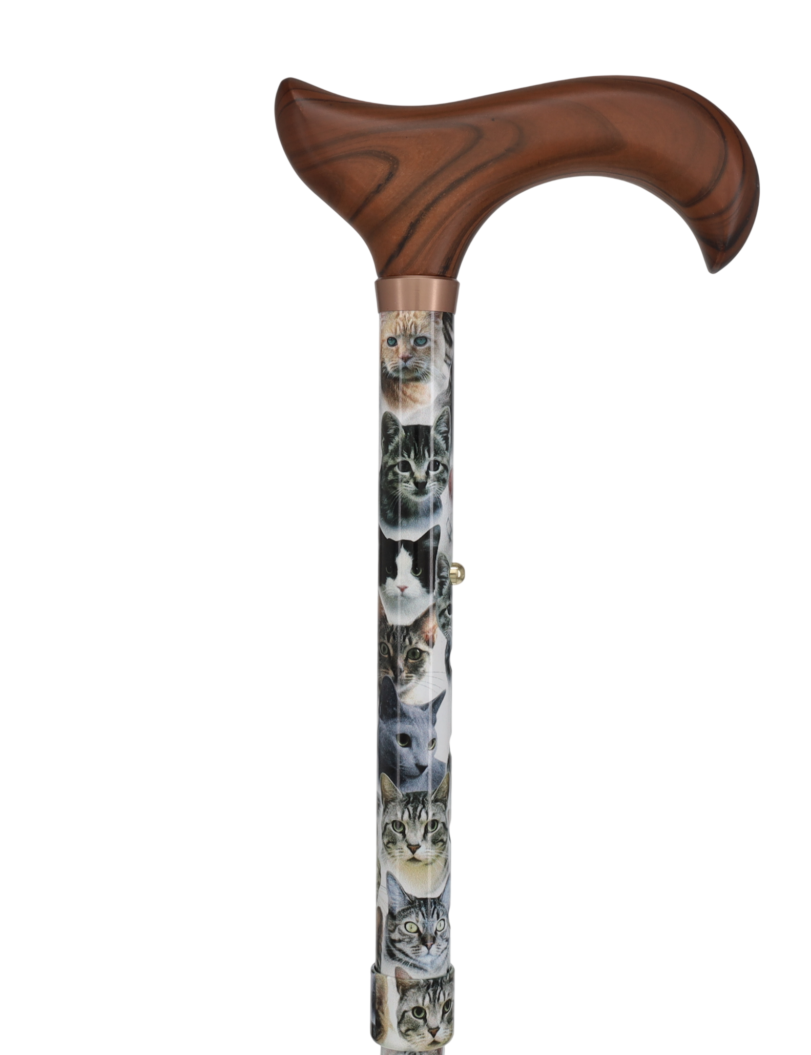 What meow? Whether you have a one, two or a dozen cats or are an avid cat lover, this adjustable and foldable walking cane will suite you're fancy. The cane features a wooden derby style handle for a traditional look meeting a stunning golden collar. The shaft displays various cat breeds that are sure to remind you of your special furry friends.