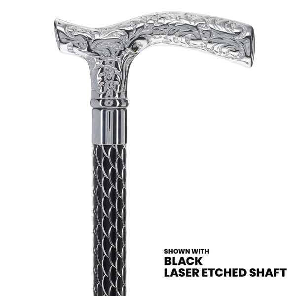This stunning chrome plated fritz walking cane is sure to draw eyes at any formal event. Featuring an elegant scroll design and comfortable grip. The laser etched shaft adds a unique design that is sure to turn heads. Your choice of a black etched, brown etched, or solid black shaft.
