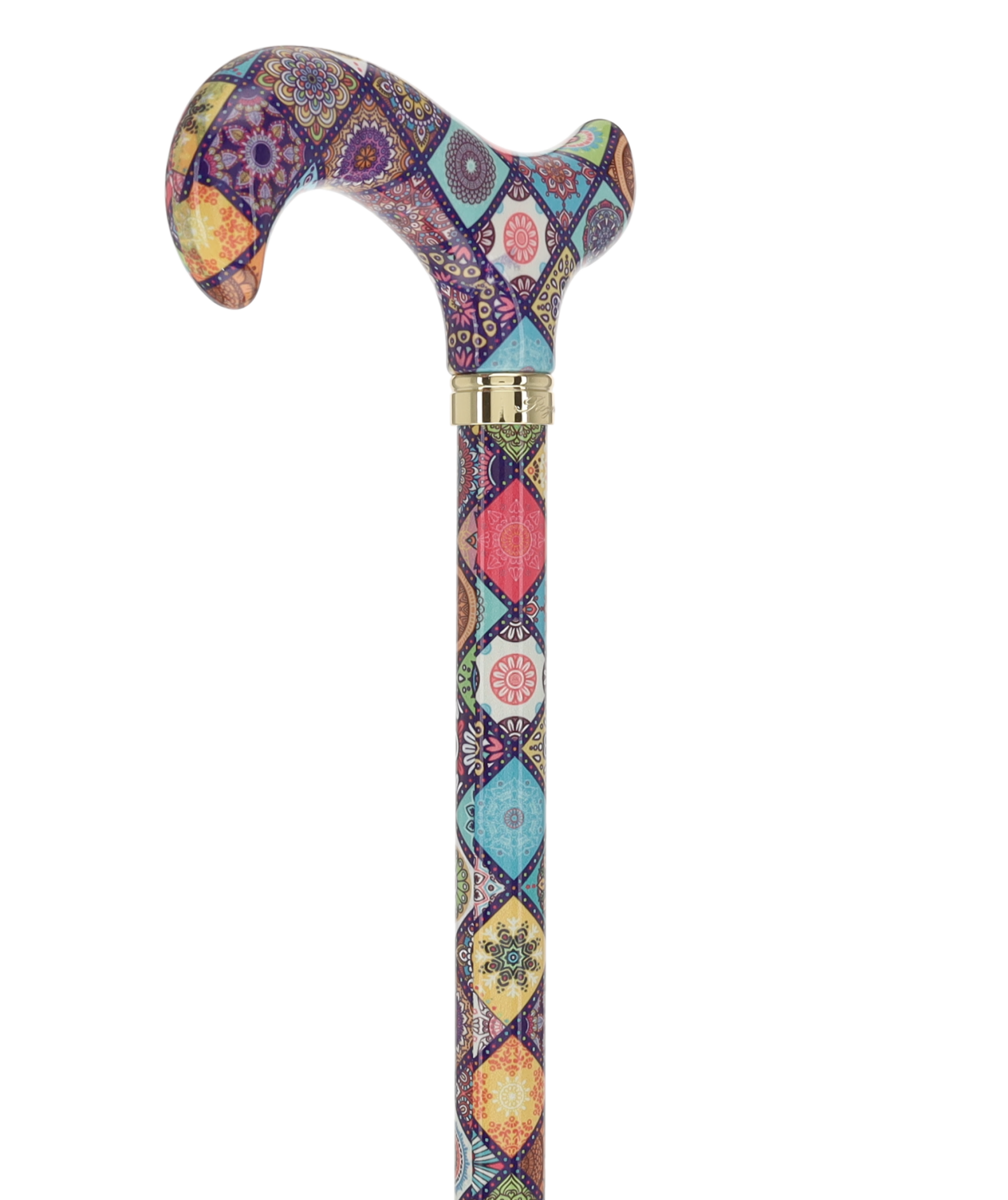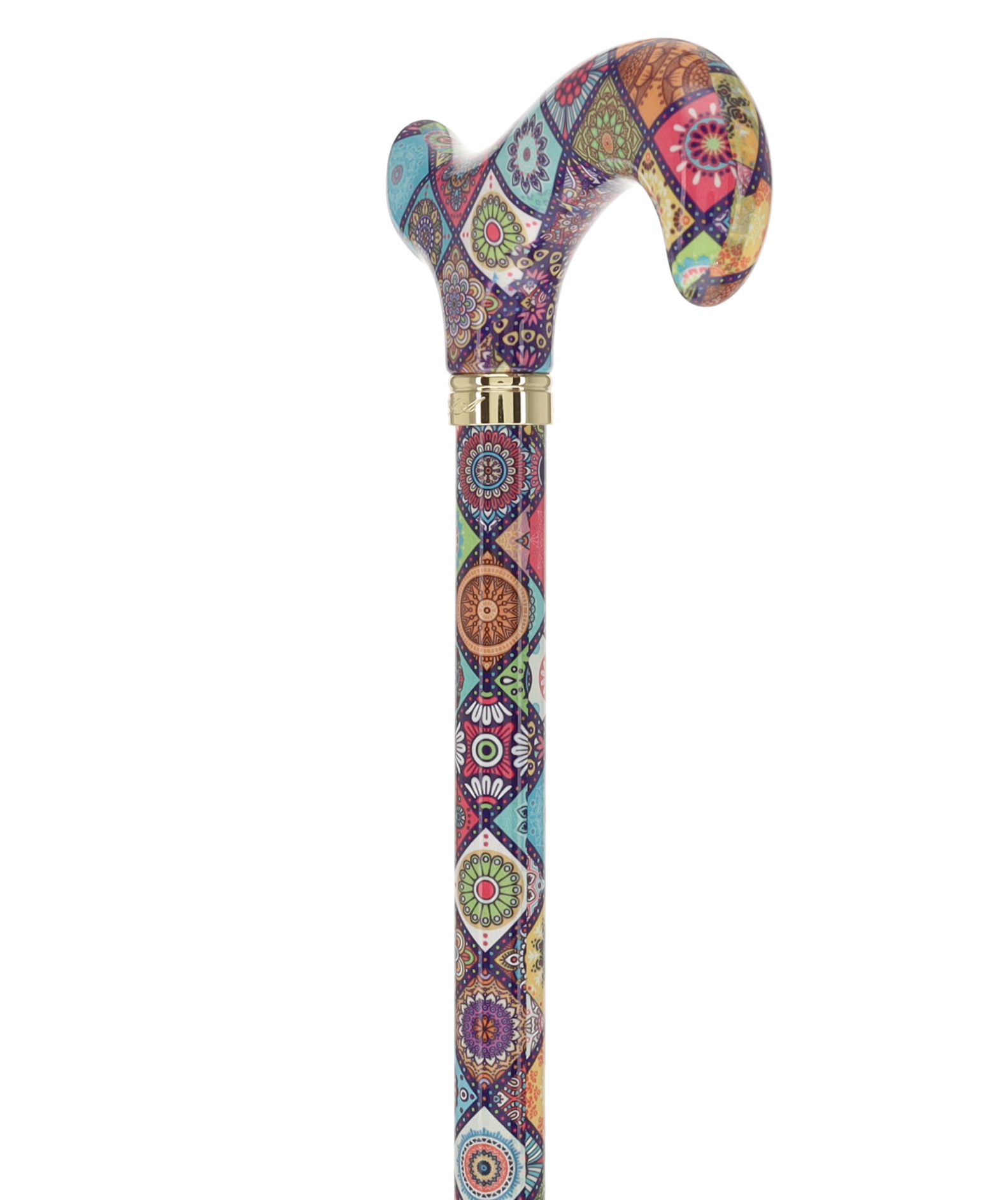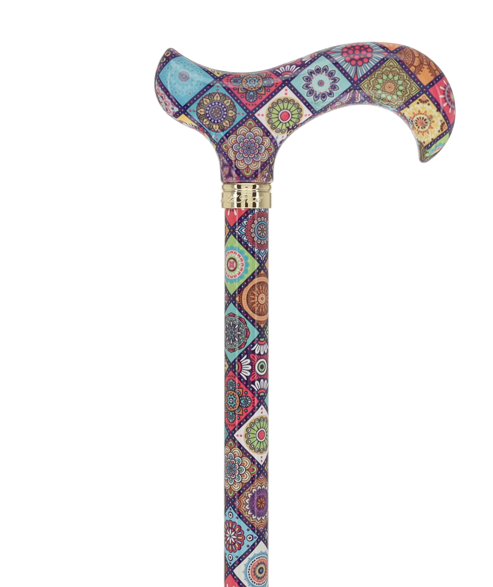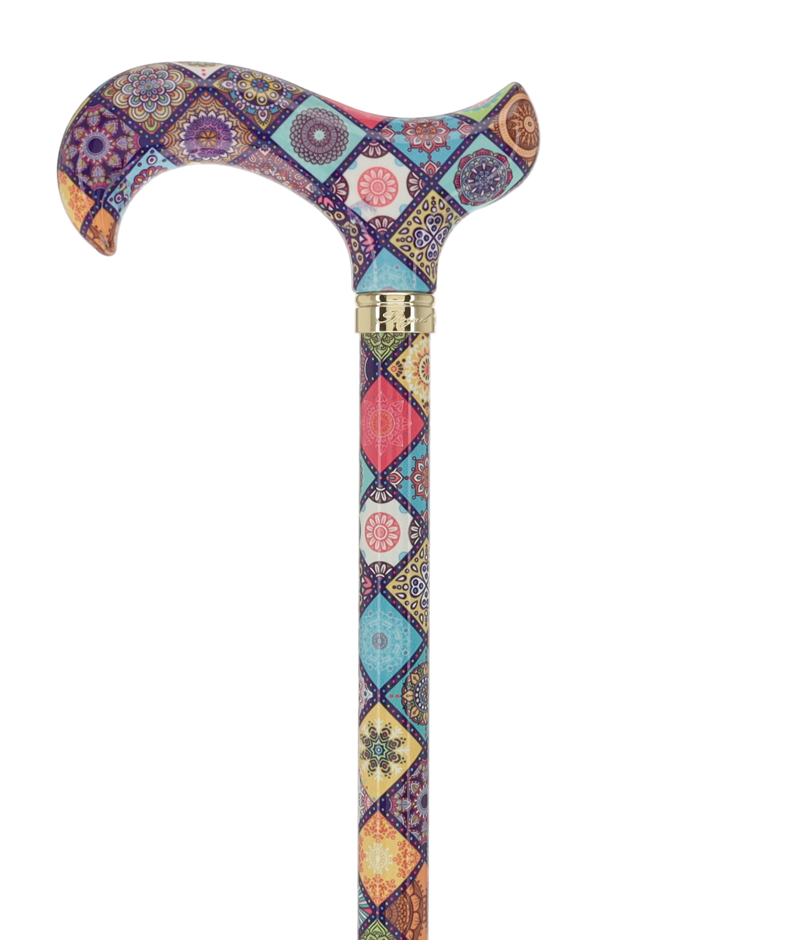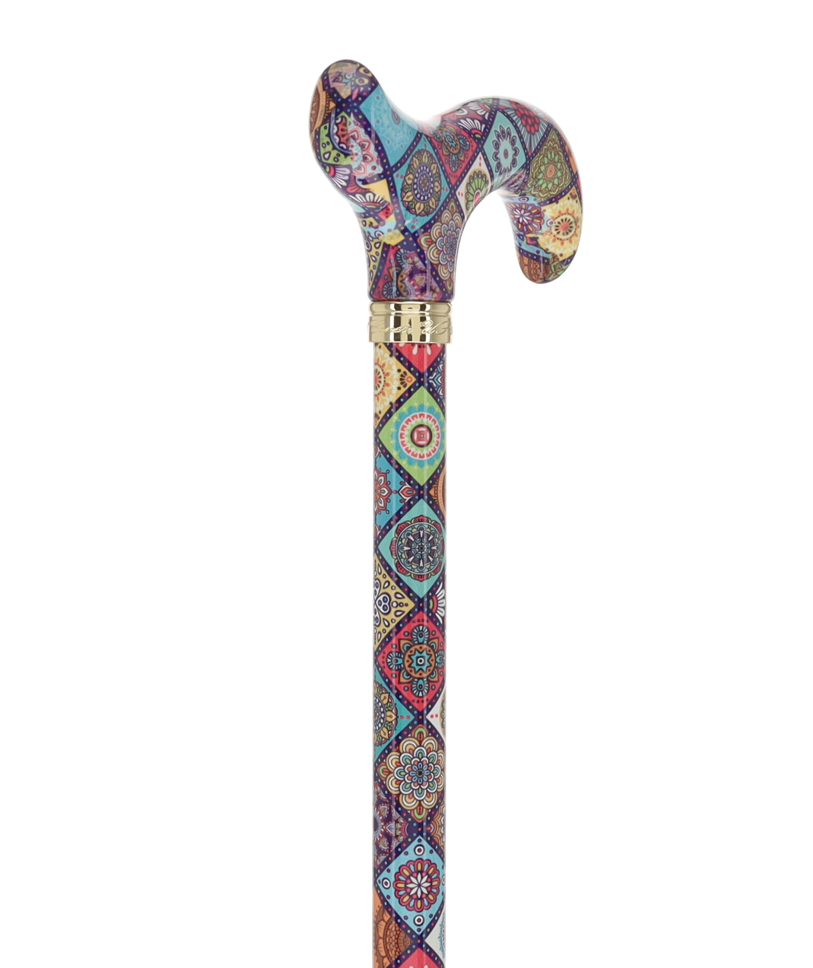 Bring your artistic side wherever you go with the FashionStix Colorful Collage Adjustable Designer Derby Walking Cane. This creative, eye-catching cane will be a conversation piece, with its beautiful colors and details - plus a gold engraved collar - making it a unique work of art. Crafted from high quality aluminum, this strong and durable Derby Cane lets you adjust the height with a flat lock nut to stay comfortable. So take a stroll in style with this one-of-a-kind showstopper! Includes a 16 mm black tip.
