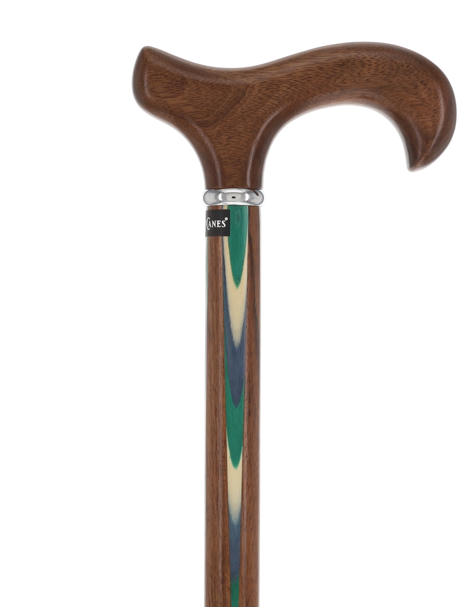 The dramatic style of this walking cane is both beautiful and unique. The colors are not painted on the shaft but instead are actual colored pieces of wood inlaid in the shaft of the cane. These pieces of blue and green inlaid wood give it a very colorful and dramatic appearance. The process of making these walking canes takes a highly skillful craftsmen. The procedure that is used to create these canes is very unique. The red and green wood is inlaid in a block of wood and then pressed and turned(carved) into a round shaft. The end result is beautiful handcrafted masterpiece that has to be seen in person to be truly appreciated. These attractive walking canes come adorned with a shiny brass collar and are available at 37 inches or shorter. The main shaft of the cane is made out a beautiful exotic Ovangkol wood shaft.