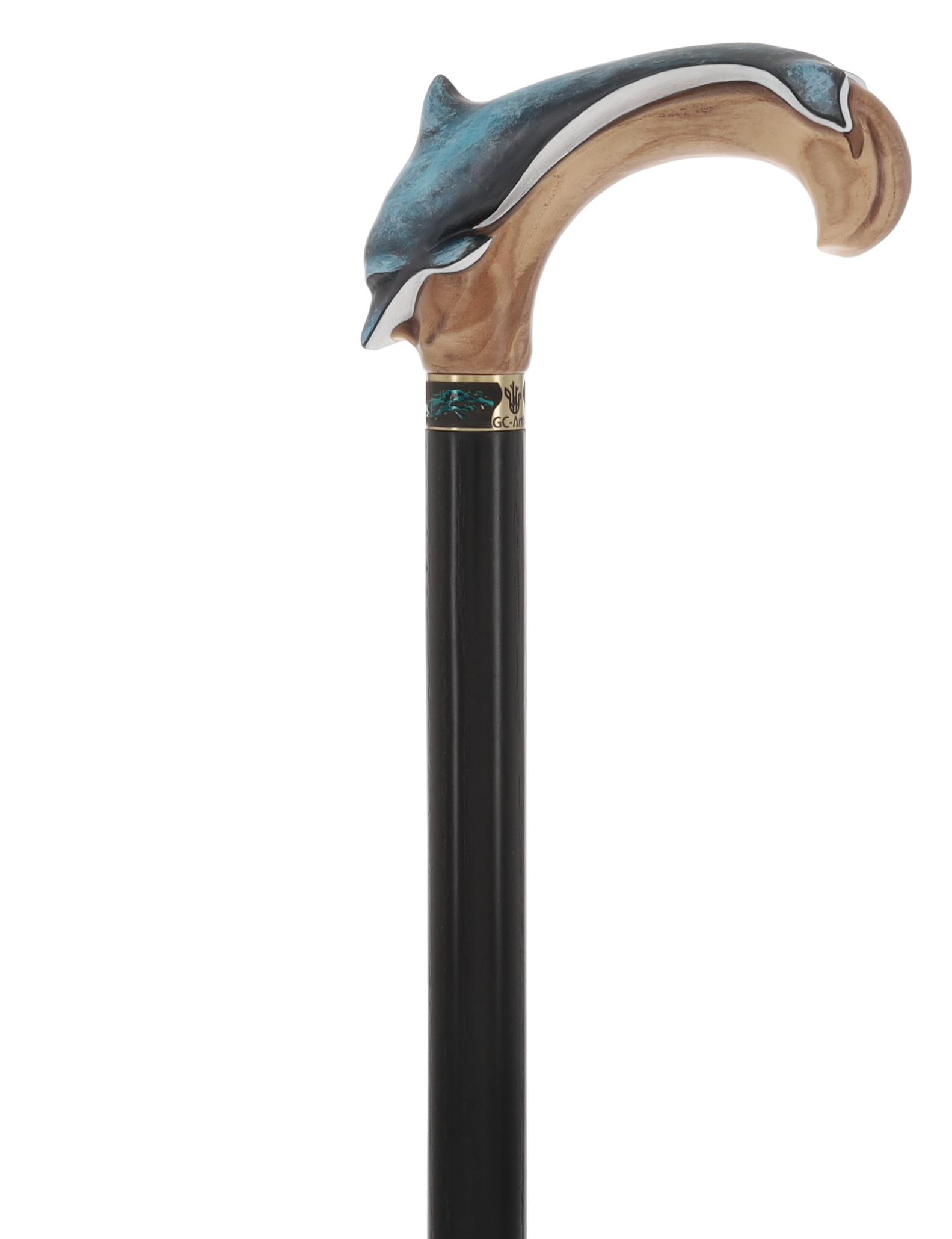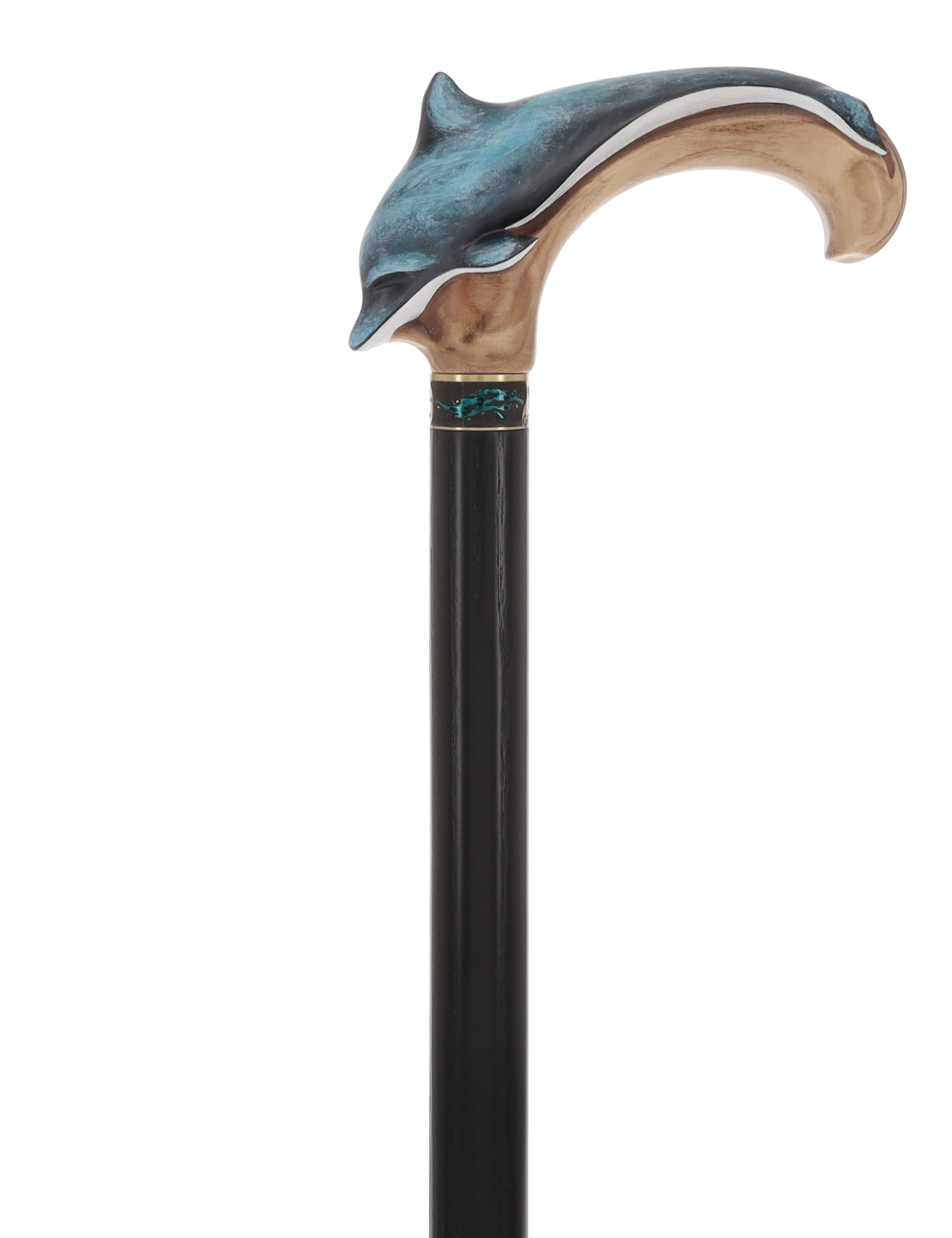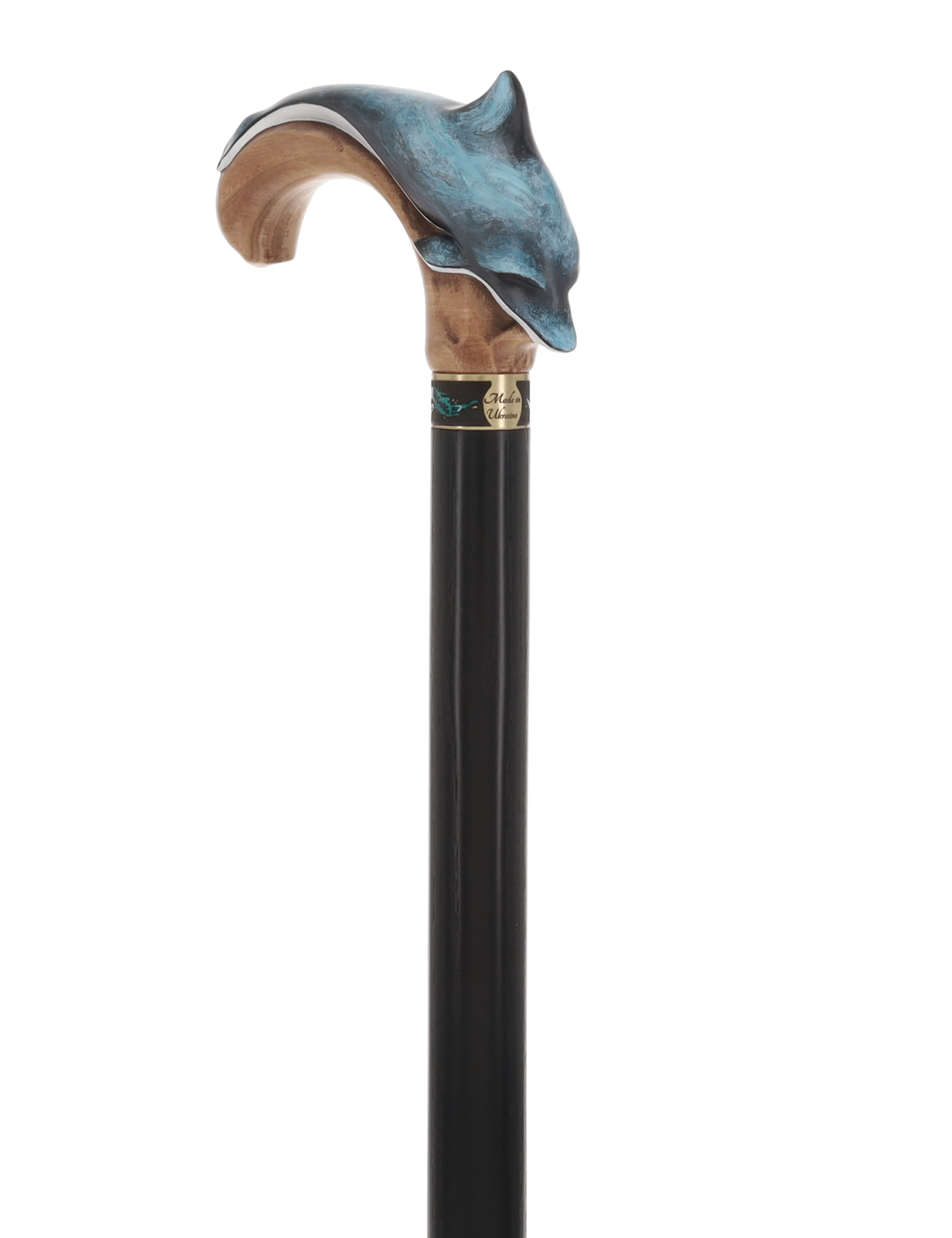 Unlike many other canes, this piece celebrates the materials it's made from. The shaft is finished in a light, clear coat, showcasing the warm, beautiful grain of the natural Ash wood. An elegant, jewelry-quality brass collar—inlaid with subtle aquatic tones—provides a stunning transition from the painted handle to the natural wood shaft.