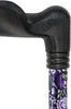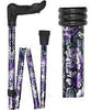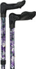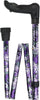 This feminine and elegant ladies walking cane is a wonderful accent that will add a touch of pastoral flair to any outfit. The alumiunium adjustable design makes this walking cane perfect for everyday use, while the comfortable contoured palm-grip handle is one of the most comfortable styles available. The lovely pattern compliments this beautiful sturdy and reliable cane, with purple, white blooms and light green leaves on a black background. This walking cane adjusts from 34 inches to 39 inches H, making it perfect for users between 5 foot 8 inches and 6 foot 6 inches tall, and it can be customized to suit customers of differing heights. Place your order today!